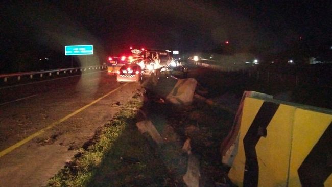 Sesampainya di lokasi kejadian, bus tiba-tiba menabrak pembatas di tengah jalan tol. Akibatnya, bus mengalami kerusakan di bagian depan.