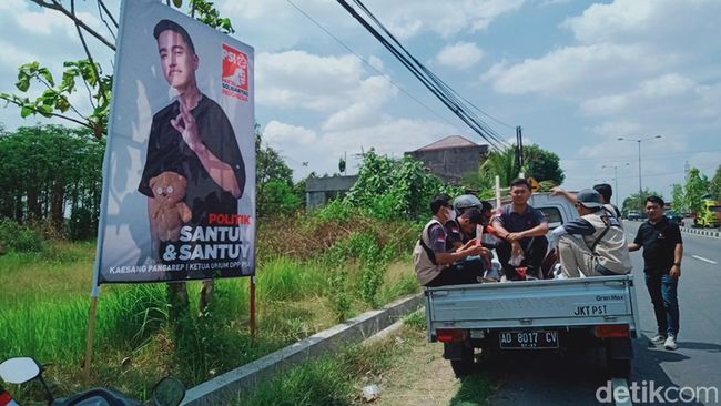Baliho Kaesang tersebut membawa boneka dengan tulisan 'Politik Santun & Santuy' dengan simbol partai politik. Baliho bergambar Jokowi bertulis 'Nderek Jokowi' dan partai politik juga tidak dicopot.