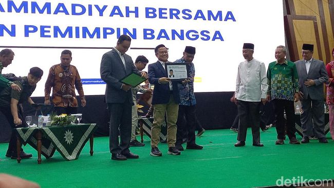 Penyerahan kado spesial itu langsung diberikan oleh Ketua Umum PP Muhammadiyah Haedar Nashir usai acara kepada Anies dan Cak Imin.