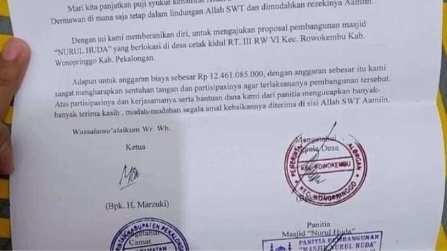 Surat edaran proposal permohonan sumbangan pembangunan sebuah masjid di Desa Jetak Kidul, Kecamatan Wonopringgo, Kabupaten Pekalongan jadi perhatian di media sosial. Total pembangunan masjid disebut mencapai Rp 12,46 miliar, bahkan satu batu bata dihargai Rp 800 ribu.