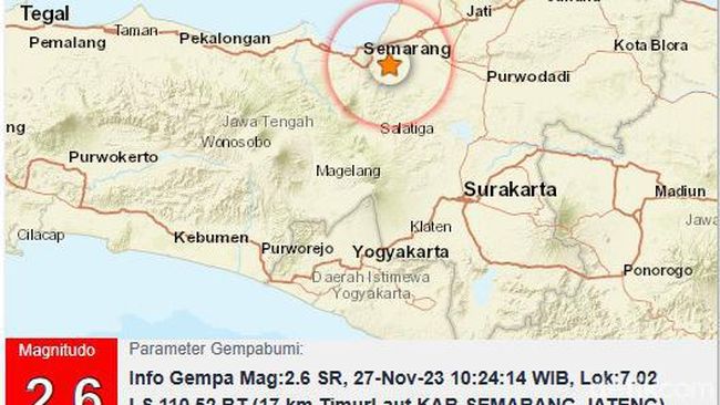 Gempa berkekuatan magnitudo 2,6 terjadi di Semarang. Gempa ini berpusat di darat.
