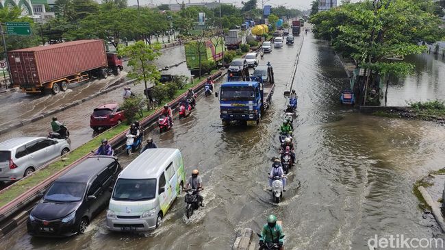 Jalur pantura Genuk, Kota Semarang, sebagian masih terendam banjir pagi ini. Meski demikian kendaraan bisa melintas tapi harus ekstra hati-hati.