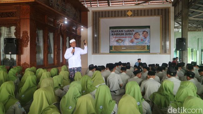 "Kita mengadakan yang namanya istigosah, pondok pesantren yang terdiri dari SMP, SMK, Aliyah dan pesantren itu semua berdiri berkat berdoa bersama, bahkan mempunya jargon ayo ngaji, ayo sekolah, mangan bareng, menyelesaikan masalah, itu adalah jargon kita sehingga anak-anak menjadi kuat, akalnya kuat, badannya juga sehat," ia melanjutkan.