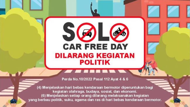 Memasuki masa kampanye, Pemerintah Kota Solo dalam hal ini Dinas Perhubungan (Dishub) melarang adanya kegiatan berbau politik dan kampanye di Solo Car Free Day (CFD). Aturan ini tertuang dalam Perda Nomor 10 tahun 2022 tentang Penyelenggaraan Perhubungan.
