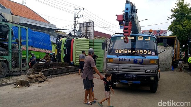 Sebuah truk tronton muatan gula terguling di Jalur Pantura Wiradesa, Kabupaten Pekalongan. Truk terguling lantaran pengemudi menghindari motor yang diduga sedang balap liar.