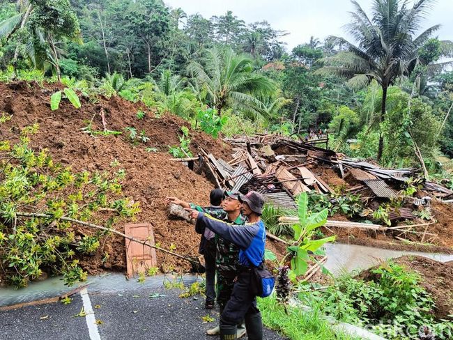 Bersama sejumlah warga lain, Wawan langsung mengecek ke sumber suara gemuruh itu. Saat itulah dia melihat tanah longsor sudah menutup badan jalan dan merobohkan satu rumah yang dihuni 6 orang.