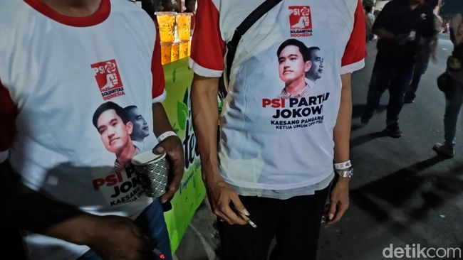 Pantauan detikJateng di lokasi HUT ke-9 PSI di Stadion Jatidiri, Semarang, Sabtu (9/12/2023), terlihat mayoritas massa yang hadir memakai kaus dengan tulisan 'PSI Partai Jokowi' di depannya. Kaus tersebut berwarna putih dengan tulisan berwarna merah.