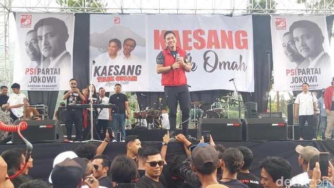Saat lagu ketika, jinggle PSI, Kaesang pun turun panggung dan berjoget bersama dengan massa pendukungnya. Lagu Laskar Pelangi, menjadi penutup dari Giring menghibur massa PSI.