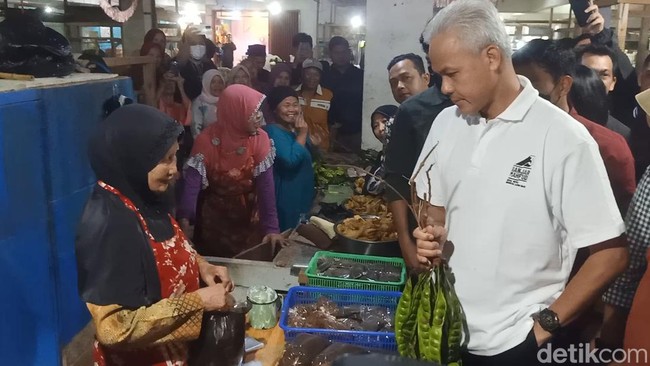 Calon presiden nomor urut 3, Ganjar Pranowo blusukan ke Pasar Induk Wonosobo. Selain cek harga sembako jelang perayaan Natal dan tahun baru (Nataru), Ganjar juga memborong petai hingga kopiah.