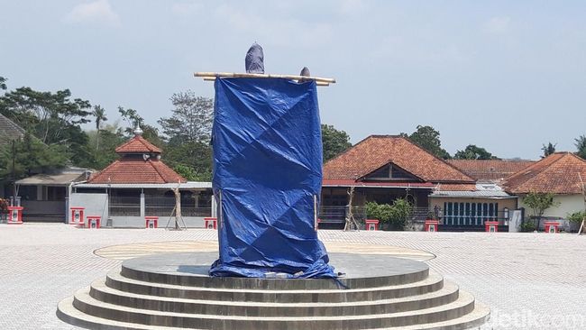 Meski telah diresmikan, tugu tersebut hingga kini hanya ditutup terpal.