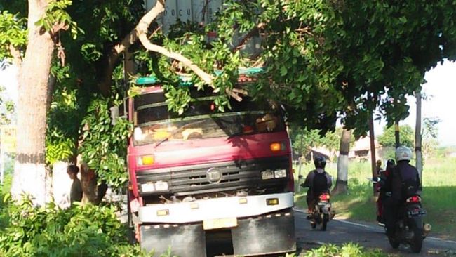 Pohon berdiameter sekitar 40 sentimeter. Akibat boks kontainer tersangkut dahan, truk pun tidak bisa maju.