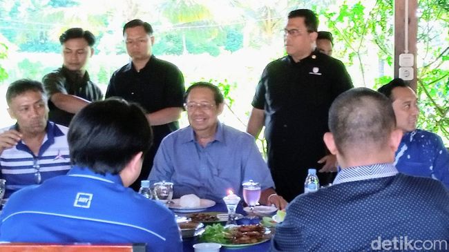 Usai santap siang, SBY kemudian menyapa kader Partai Demokrat yang sudah menunggu di tenda. Acara bertajuk 'Temu Kader Partai Demokrat Bersama Bapak SBY Presiden RI ke-6' ini berlangsung di halaman belakang rumah makan.
