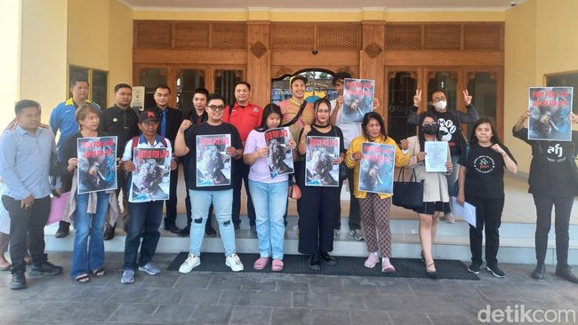 Di sela-sela proses pembuatan aduan itu, mereka sempat membentangkan poster bergambar anjing bernama Lato di halaman Mapolresta Solo.