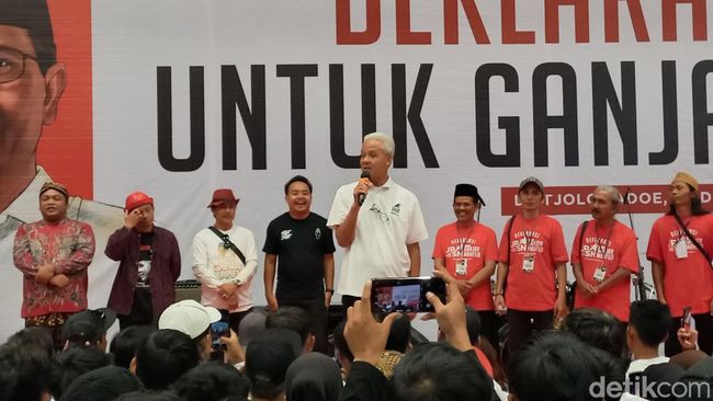 Capres nomor urut 03 Ganjar Pranowo, menghadiri acara deklarasi dukungan dari Jaringan Pencak Silat Nusantara (JPSN) di De Tjolomadu, Kecamatan Colomadu, Kabupaten Karanganyar. Berbagai kelompok silat di Solo Raya hadir dalam acara itu.