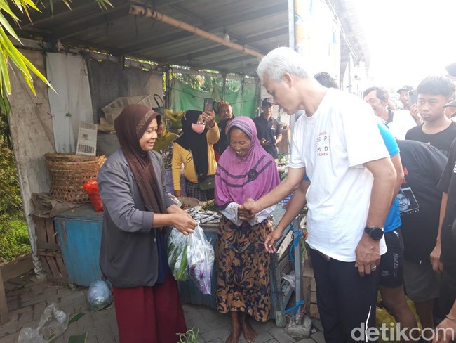 Ganjar kemudian masuk ke dalam pasar dan menemui sejumlah pedagang, bertanya seputar harga sayuran dan bahan pokok.
