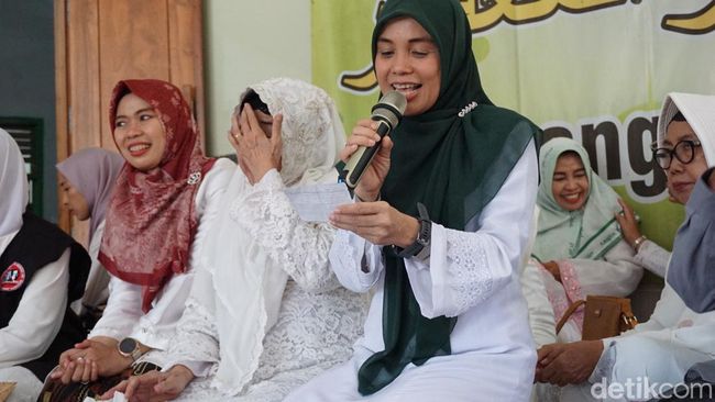Nampak jamaah ibu-ibu yang hadir antusias dengan kehadiran Atikoh. Ia mengenakan gamis putih dan kerudung warna hijau gelap.