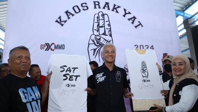 Ganjar menyablon kaus bertulis 'SAT SET' dan lambang tiga jari yang bertuliskan 'GP MMD'. Dalam pertemuan itu, Ganjar menyablon kaus kampanye untuk para relawannya. Kaus itu kemudian dibagikan secara gratis kepada relawan yang hadir.
