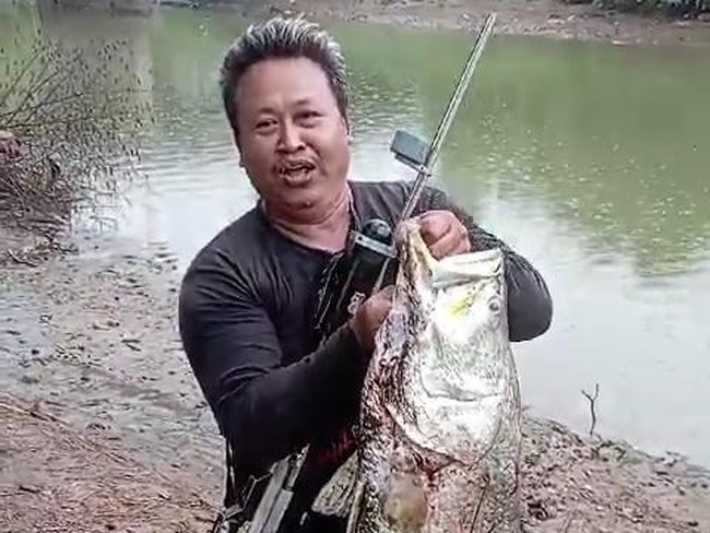 Bermodal senapan, Eko langsung membidik ikan yang ada di sungai tersebut. Ikan jumbo itu sempat melawan hingga benang yang menyangkut di senapan sempat putus.
