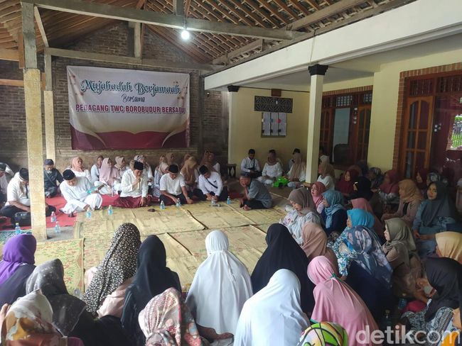 Para pedagang di kompleks Candi Borobudur, Kabupaten Magelang, menggelar aksi 'Mujahadah Berjamaah Bersama Pedagang TWC Borobudur Bersatu'. Mereka menolak rencana pemindahan dari lokasi berjualan semula mulai Senin pekan depan.