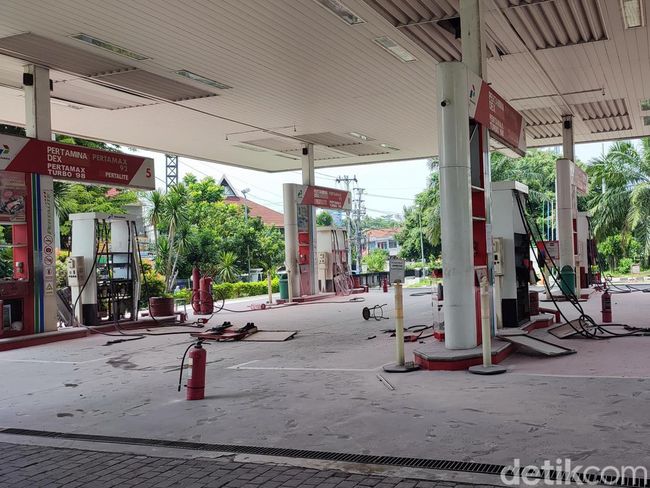 Ada enam mesin pengisi bensin yang berada di lokasi, lima di antaranya porak-poranda. Satu sepeda motor juga terlihat masih tergeletak di lokasi.