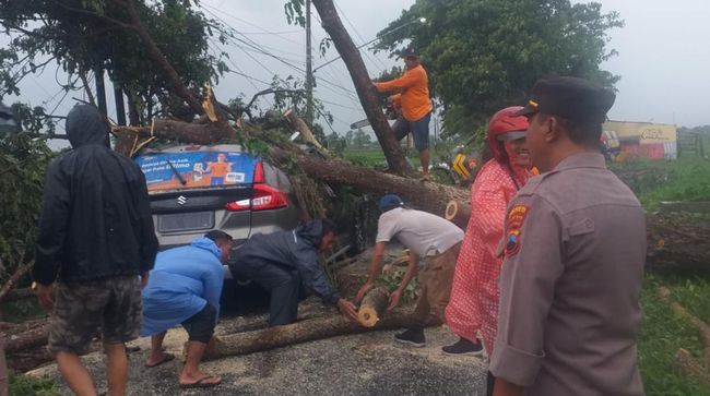 Hujan disertai angin kencang di Klaten menyebabkan sebuah pohon besar di jalur Kalikotes-Trucuk, Klaten, tumbang. Mobil yang sedang melintas tertimpa pohon tersebut.