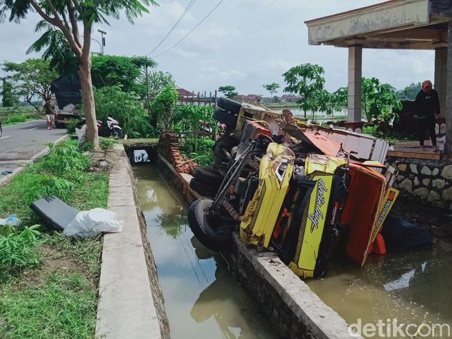Pantauan detikJateng di lokasi, truk itu terguling ke sawah setelah melompati saluran air irigasi. Truk itu juga menghantam pagar batu bata dan menyerempet pohon di lokasi meski tidak sampai ambruk.