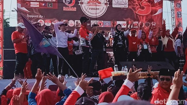 Sri Mulyani kemudian menyapa massa di tengah hiburan musik sambil membagikan jaket dan kaos dari atas panggung. Sri Mulyani meminta masyarakat mendoakan Ganjar Pranowo sehat.
