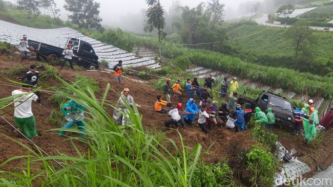 Tanah longsor di Selo, Boyolali tak hanya menutup jalur wisata Solo-Selo-Borobudur (SSB). Ada dua mobil pikap yang masuk ke ladang karena terdorong longsor susulan.