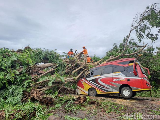 Bus kecil yang tertimpa pohon itu berpelat nomor AD 7545 OG. Berdasarkan informasi yang dihimpun Alfan, ada dua korban luka ringan akibat peristiwa itu. Selain itu, dua bangunan rumah juga terdampak pohon tumbang tersebut.