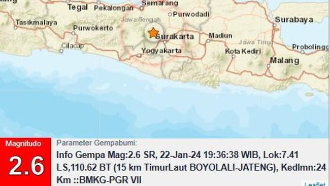Gempa bumi berkekuatan magnitudo (M) 2,6 terjadi di Kabupaten Boyolali, Jawa Tengah, malam ini. Pusat gempa di darat.