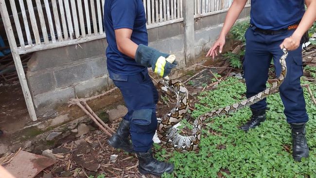 Sejumlah petugas pemadam kebakaran pun langsung datang lengkap dengan membawa alat untuk mengevakuasi ular. Ular itu pun dengan mudah ditangkap dan dimasukkan ke boks kontainer plastik.