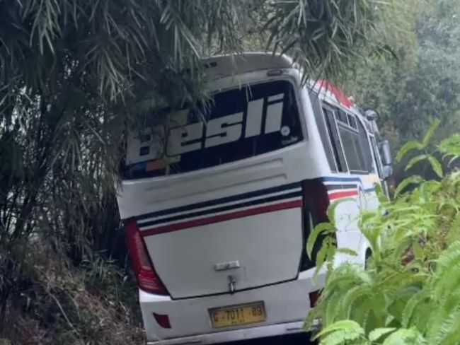 Hujan deras yang terjadi sejak Minggu siang, membuat tebing yang berada di sisi jalur Pekalongan-Dieng longsor. Bahkan, sebuah bus dilaporkan terjebak longsor.