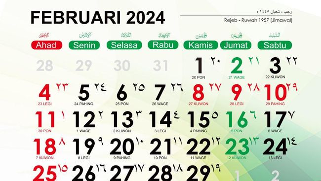 Berikut adalah kalender Hijriah Februari 2024 lengkap: