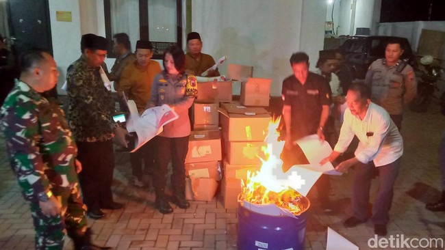 Setelah doa, ribuan surat suara dimasukkan tong untuk dibakar sampai habis. Karena hanya satu tong, pemusnahan berjalan lambat.