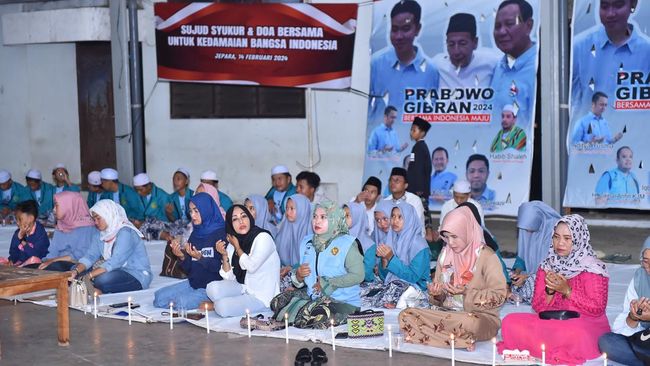 Relawan Capres dan Cawapres, Prabowo Subianto dan Gibran Rakabuming Raka di Kabupaten Jepara, Jawa Tengah menggelar doa bersama dan sujud syukur. Mereka bersyukur atas hasil hitung cepat yang mengunggulkan pasangan nomor urut 2 Prabowo-Gibran.