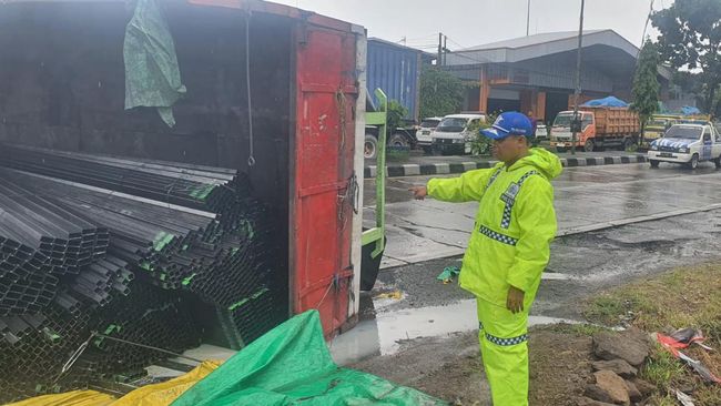 "Sesampai di TKP truk gandeng mengerem kemudian ban bak gandengan belakang tergelincir sehingga menabrak median jalan tengah," terang Wahyu.