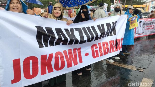 Dari pantauan derikJateng, massa memakai jas hujan dan membentangkan spanduk dengan berbagai tulisan. Aksi yang diikuti oleh emak-emak dan pria dewasa itu membentangkan spanduk 'Makzulkan Jokowi-Gibran'.