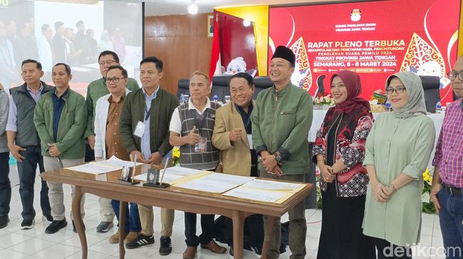 "Rincian perolehan suara pasangan calon. Data perolehan suara pasangan calon. Calon nomor 01 (Anies-Muhaimin) 2.866.373. Paslon nomor urut 02 (Prabowo-Gibran) 12.096.454. Paslon nomor urut 03 (Ganjar-Mahfud) 7.827.335," kata Muslim saat membacakan perolehan suara Capres-Cawapres di Jateng, Sabtu (9/3/2024).