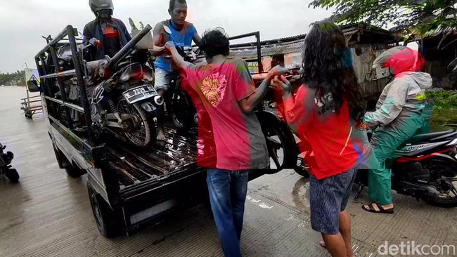 Warga sekitar pun menyediakan jasa ojek motor. Dengan menggunakan mobil pikap, warga membantu pengendara motor melintas di jalur yang kebanjiran tersebut. Mereka mengangkut motor untuk melewati jalur yang kebanjiran.