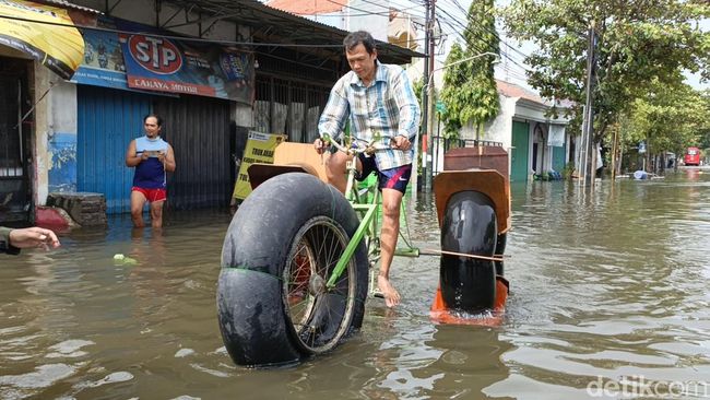 Warga korban banjir di Kaligawe, Kota Semarang, mengisi waktu dengan aktivitas unik. Salah satunya membuat sepeda yang bisa melaju di atas air.