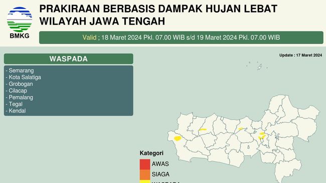 Sejumlah wilayah di 7 daerah di Jawa Tengah masuk kategori waspada dampak hujan lebat yang diprakirakan terjadi hari ini hingga besok pagi. Masyarakat pun diminta waspada terkait dengan kondisi tersebut.