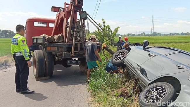 Pantauan detikJateng, mobil Mobilio AB 1908 AY terguling ke saluran irigasi tetapi tidak tercebur karena posisinya miring tersangkut pohon. Pohon mlanding yang dihantam patah dan roboh.