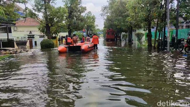 Terlihat petugas lalu lalang mengevakuasi warga dengan perahu karet. Suasana di tengah genangan banjir itu tampak sepi, hanya terlihat beberapa warga yang beraktivitas menerjang banjir.