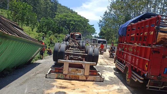 "Dimungkinkan karena kondisi jalan tikungan, sehingga truk terguling ke kiri menutup parit dan sempat terseret kurang lebih 10 Meter dari titik tergulingnya truk kontainer," imbuh Handriyani.