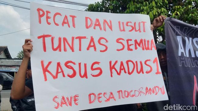 "Pecat dan usut tuntas semua kasus Kadus 1, turunkan Kadus kriminal, usut tuntas letter C desa, aksi kamisan masyarakat menggugat perangkat tak bermartabat," bunyi sejumlah spanduk dan poster yang dibawa warga.