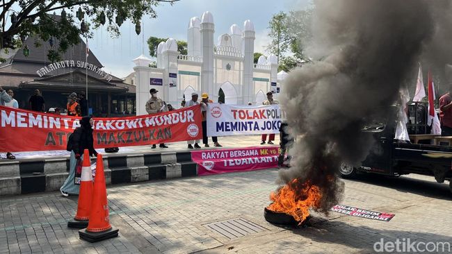 Massa Aliansi Pemuda Indonesia menggelar aksi di depan Balai Kota Solo. Mereka menyuarakan tuntutan Presiden Joko Widodo (Jokowi) turun dari jabatannya atau dimakzulkan.