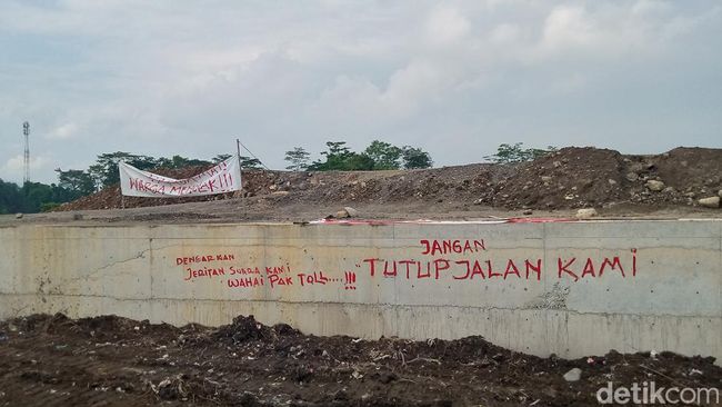 Coretan menggunakan cat berwarna merah terlihat di dinding tembok cor tepi sungai di tepi jalan desa. Di atasnya tanah timbunan proyek tol sudah setinggi sekitar tiga meter.