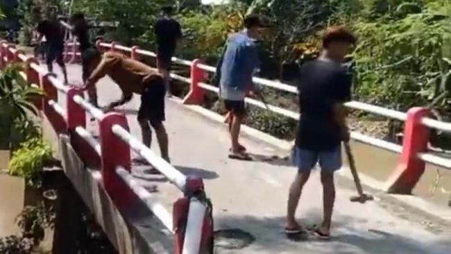 Dalam video yang diposting akun Instagram @demakhariini, tampak sejumlah pemuda tersebut melakukan perusakan tepian jembatan dengan menggunakan palu besar.