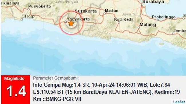 Gempa bumi berkekuatan magnitudo 1,4 terjadi di Klaten. Gempa ini berpusat di darat.
