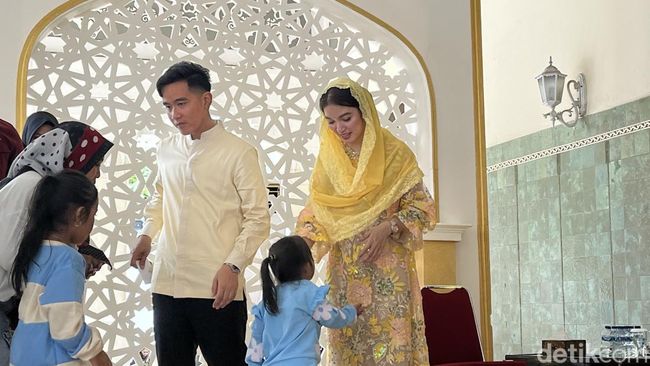 Wali Kota Solo Gibran Rakabuming Raka merayakan menggelar open house di rumah dinas Loji Gandrung, Solo. Gibran menyambut warga didampingi sang istri, Selvi Ananda yang tampak anggun mengenakan gamis bercorak bunga warna kuning.